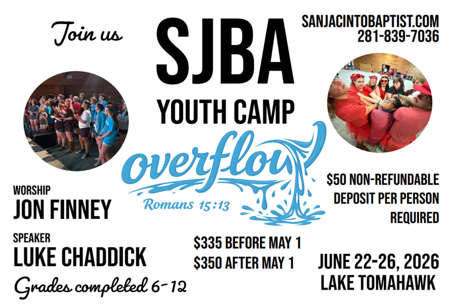 Churches: Please click HERE to request the 2026 Blank Youth Camp Registration & Housing online spreadsheet link be sent to you. This online Google Sheets form includes church registration, housing, and a change sheet for adds/deletes. You will be able to make timely updates to the online sheet. If you have any questions, please contact us at sjba@sanjacintobaptist.com or call us at 281.839.7036.